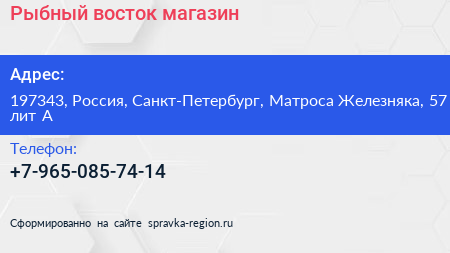Рыбный восток, магазин по адресу 197343, Россия, Санкт-Петербург, Матроса Железняка, 57 лит А в дальнейшем Организация, размещена в следующих категориях: