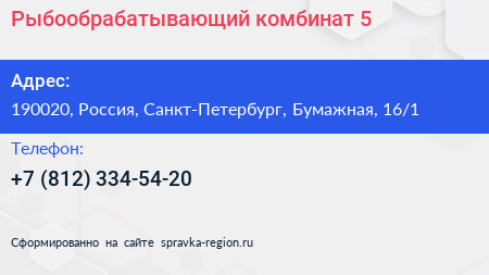 Рыбообрабатывающий комбинат №5 по адресу 190020, Россия, Санкт-Петербург, Бумажная, 16/1 в дальнейшем Организация, размещена в следующих категориях: