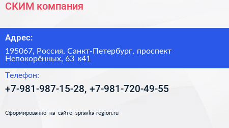 СКИМ, компания по адресу 195067, Россия, Санкт-Петербург, проспект Непокорённых, 63 к41 в дальнейшем Организация, размещена в следующих категориях: