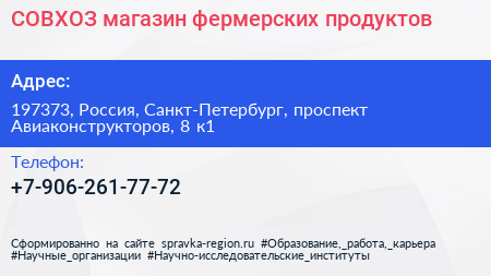 СОВХОЗ, магазин фермерских продуктов по адресу 197373, Россия, Санкт-Петербург, проспект Авиаконструкторов, 8 к1 в дальнейшем Организация, размещена в следующих категориях: