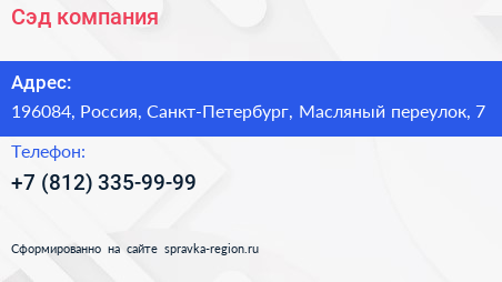 Для связи с организацией воспользуйтесь номером телефона: +7 (812) 335-99-99. Пн: c 09:00-19:00, Вт: c 09:00-19:00, Ср: c 09:00-19:00, Чт: c 09:00-19:00, Пт: c 09:00-19:00, Сб: выходной, Вс: выходной, вы можете обратиться в эту организацию.
