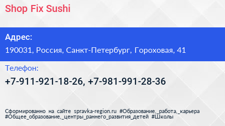 Shop Fix Sushi по адресу 190031, Россия, Санкт-Петербург, Гороховая, 41 в дальнейшем Организация, размещена в следующих категориях: