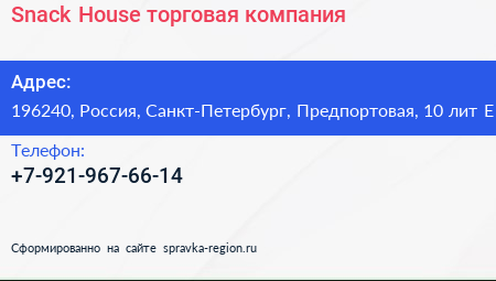 Snack House, торговая компания по адресу 196240, Россия, Санкт-Петербург, Предпортовая, 10 лит Е в дальнейшем Организация, размещена в следующих категориях: