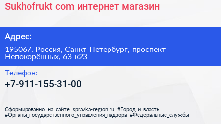 Sukhofrukt.com, интернет-магазин по адресу 195067, Россия, Санкт-Петербург, проспект Непокорённых, 63 к23 в дальнейшем Организация, размещена в следующих категориях:
