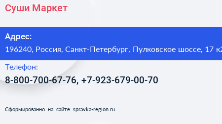 Суши-Маркет по адресу 196240, Россия, Санкт-Петербург, Пулковское шоссе, 17 к2 в дальнейшем Организация, размещена в следующих категориях: