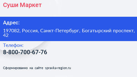 Суши-Маркет по адресу 197082, Россия, Санкт-Петербург, Богатырский проспект, 42 в дальнейшем Организация, размещена в следующих категориях: