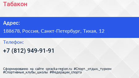 Табакон по адресу 188678, Россия, Санкт-Петербург, Тихая, 12 в дальнейшем Организация, размещена в следующих категориях: