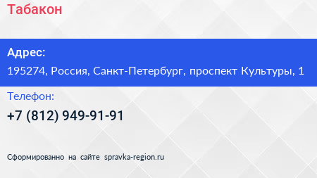 Табакон по адресу 195274, Россия, Санкт-Петербург, проспект Культуры, 1 в дальнейшем Организация, размещена в следующих категориях: