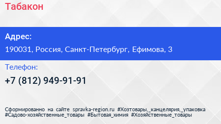 Табакон по адресу 190031, Россия, Санкт-Петербург, Ефимова, 3 в дальнейшем Организация, размещена в следующих категориях: