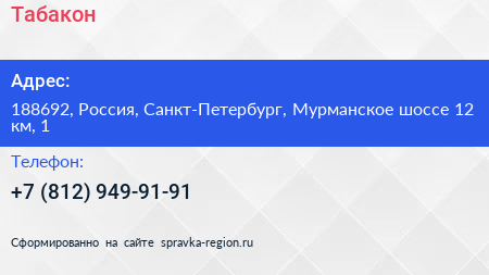Табакон по адресу 188692, Россия, Санкт-Петербург, Мурманское шоссе 12 км, 1 в дальнейшем Организация, размещена в следующих категориях: