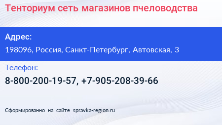 Тенториум, сеть магазинов пчеловодства по адресу 198096, Россия, Санкт-Петербург, Автовская, 3 в дальнейшем Организация, размещена в следующих категориях: