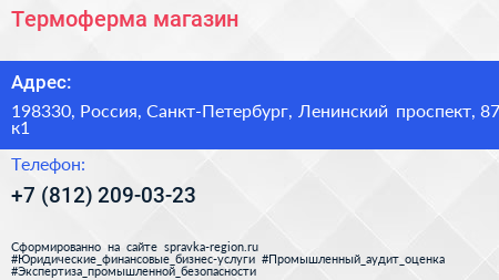 Термоферма, магазин по адресу 198330, Россия, Санкт-Петербург, Ленинский проспект, 87 к1 в дальнейшем Организация, размещена в следующих категориях: