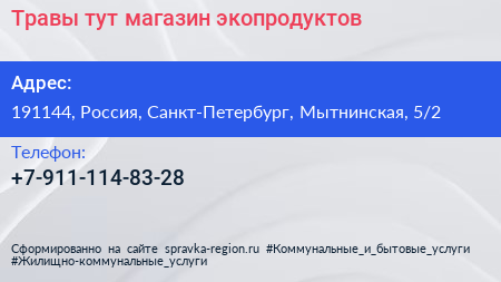 Травы тут!, магазин экопродуктов по адресу 191144, Россия, Санкт-Петербург, Мытнинская, 5/2 в дальнейшем Организация, размещена в следующих категориях: