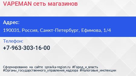 VAPEMAN, сеть магазинов по адресу 190031, Россия, Санкт-Петербург, Ефимова, 1/4 в дальнейшем Организация, размещена в следующих категориях: