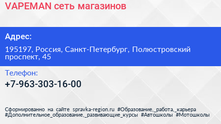VAPEMAN, сеть магазинов по адресу 195197, Россия, Санкт-Петербург, Полюстровский проспект, 45 в дальнейшем Организация, размещена в следующих категориях: