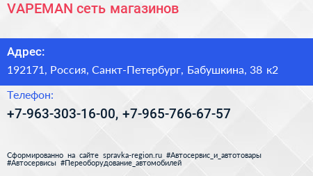 VAPEMAN, сеть магазинов по адресу 192171, Россия, Санкт-Петербург, Бабушкина, 38 к2 в дальнейшем Организация, размещена в следующих категориях: