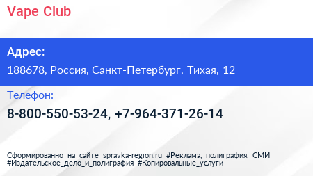 Vape Club по адресу 188678, Россия, Санкт-Петербург, Тихая, 12 в дальнейшем Организация, размещена в следующих категориях: