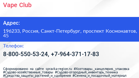 Vape Club по адресу 196233, Россия, Санкт-Петербург, проспект Космонавтов, 45 в дальнейшем Организация, размещена в следующих категориях:
