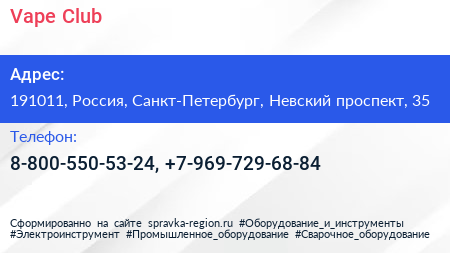 Vape Club по адресу 191011, Россия, Санкт-Петербург, Невский проспект, 35 в дальнейшем Организация, размещена в следующих категориях: