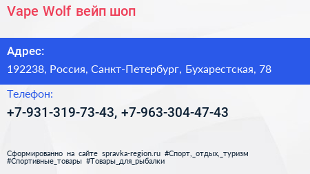 Vape Wolf, вейп-шоп по адресу 192238, Россия, Санкт-Петербург, Бухарестская, 78 в дальнейшем Организация, размещена в следующих категориях: