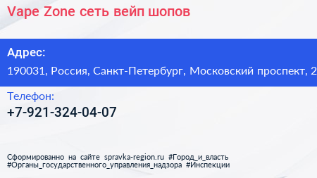 Vape Zone, сеть вейп-шопов по адресу 190031, Россия, Санкт-Петербург, Московский проспект, 2 в дальнейшем Организация, размещена в следующих категориях: