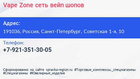 Vape Zone, сеть вейп-шопов по адресу 191036, Россия, Санкт-Петербург, Советская 1-я, 10 в дальнейшем Организация, размещена в следующих категориях: