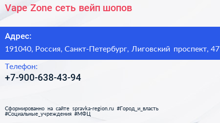 Vape Zone, сеть вейп-шопов по адресу 191040, Россия, Санкт-Петербург, Лиговский проспект, 47 в дальнейшем Организация, размещена в следующих категориях: