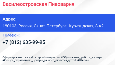 Василеостровская Пивоварня по адресу 190103, Россия, Санкт-Петербург, Курляндская, 8 к2 в дальнейшем Организация, размещена в следующих категориях: