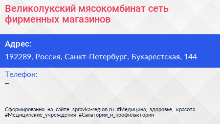 Великолукский мясокомбинат, сеть фирменных магазинов по адресу 192289, Россия, Санкт-Петербург, Бухарестская, 144 в дальнейшем Организация, размещена в следующих категориях: