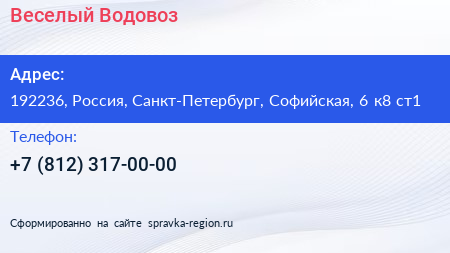 Веселый Водовоз по адресу 192236, Россия, Санкт-Петербург, Софийская, 6 к8 ст1 в дальнейшем Организация, размещена в следующих категориях: