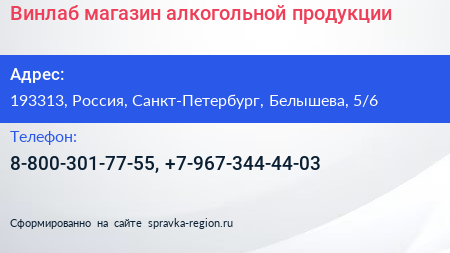 Винлаб, магазин алкогольной продукции по адресу 193313, Россия, Санкт-Петербург, Белышева, 5/6 в дальнейшем Организация, размещена в следующих категориях: