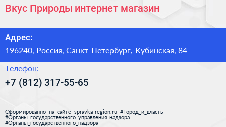 Вкус Природы, интернет-магазин по адресу 196240, Россия, Санкт-Петербург, Кубинская, 84 в дальнейшем Организация, размещена в следующих категориях:
