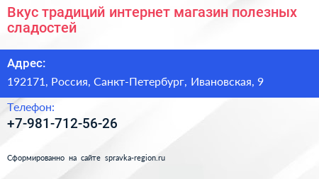 Вкус традиций, интернет-магазин полезных сладостей по адресу 192171, Россия, Санкт-Петербург, Ивановская, 9 в дальнейшем Организация, размещена в следующих категориях: