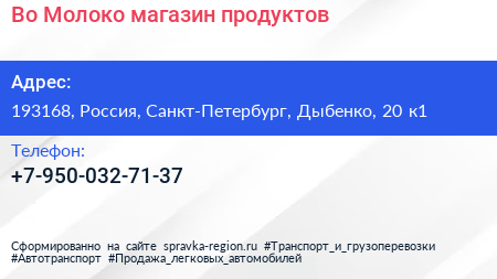Во! Молоко, магазин продуктов по адресу 193168, Россия, Санкт-Петербург, Дыбенко, 20 к1 в дальнейшем Организация, размещена в следующих категориях: