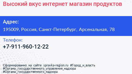 Высокий вкус, интернет-магазин продуктов по адресу 195009, Россия, Санкт-Петербург, Арсенальная, 78 в дальнейшем Организация, размещена в следующих категориях: