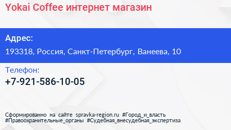 Yokai Coffee, интернет-магазин по адресу 193318, Россия, Санкт-Петербург, Ванеева, 10 в дальнейшем Организация, размещена в следующих категориях: