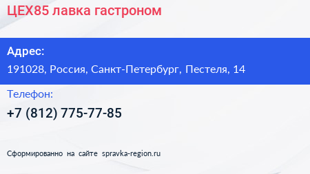 ЦЕХ85, лавка-гастроном по адресу 191028, Россия, Санкт-Петербург, Пестеля, 14 в дальнейшем Организация, размещена в следующих категориях: