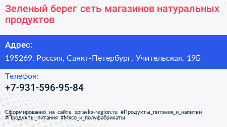 Зеленый берег, сеть магазинов натуральных продуктов по адресу 195269, Россия, Санкт-Петербург, Учительская, 19Б в дальнейшем Организация, размещена в следующих категориях: