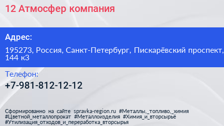 12 Атмосфер, компания по адресу 195273, Россия, Санкт-Петербург, Пискарёвский проспект, 144 к3 в дальнейшем Организация, размещена в следующих категориях: