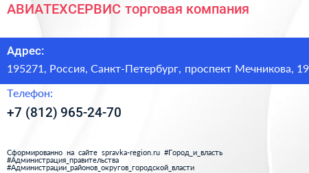 АВИАТЕХСЕРВИС, торговая компания по адресу 195271, Россия, Санкт-Петербург, проспект Мечникова, 19 в дальнейшем Организация, размещена в следующих категориях: