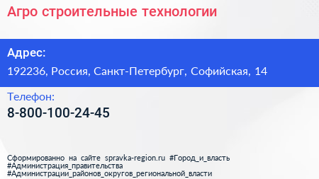 Агро-строительные технологии по адресу 192236, Россия, Санкт-Петербург, Софийская, 14 в дальнейшем Организация, размещена в следующих категориях: