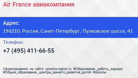 Air France, авиакомпания по адресу 196210, Россия, Санкт-Петербург, Пулковское шоссе, 41 в дальнейшем Организация, размещена в следующих категориях: