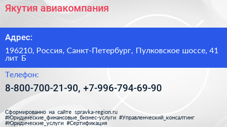 Якутия, авиакомпания по адресу 196210, Россия, Санкт-Петербург, Пулковское шоссе, 41 лит Б в дальнейшем Организация, размещена в следующих категориях: