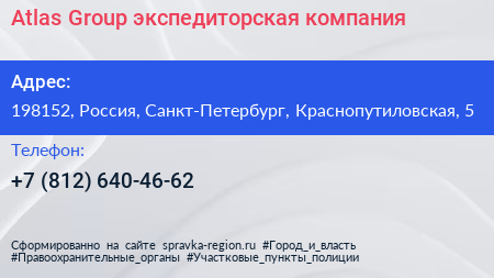 Atlas Group, экспедиторская компания по адресу 198152, Россия, Санкт-Петербург, Краснопутиловская, 5 в дальнейшем Организация, размещена в следующих категориях: