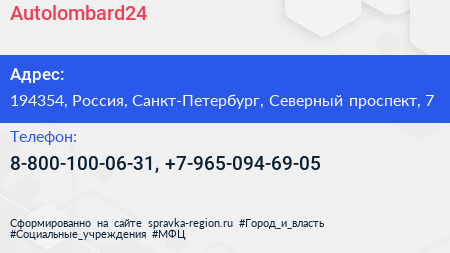 Autolombard24 по адресу 194354, Россия, Санкт-Петербург, Северный проспект, 7 в дальнейшем Организация, размещена в следующих категориях: