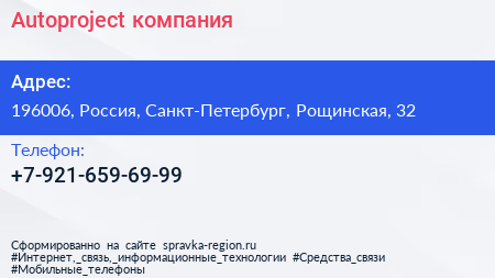 Autoproject, компания по адресу 196006, Россия, Санкт-Петербург, Рощинская, 32 в дальнейшем Организация, размещена в следующих категориях: