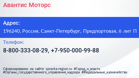 Авантис Моторс по адресу 196240, Россия, Санкт-Петербург, Предпортовая, 6 лит П в дальнейшем Организация, размещена в следующих категориях: