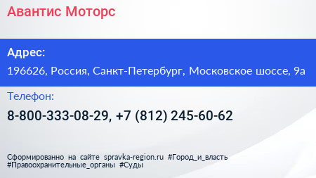 Авантис Моторс по адресу 196626, Россия, Санкт-Петербург, Московское шоссе, 9а в дальнейшем Организация, размещена в следующих категориях: