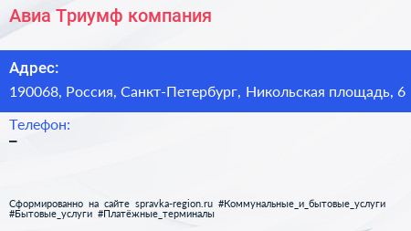 Авиа-Триумф, компания по адресу 190068, Россия, Санкт-Петербург, Никольская площадь, 6 в дальнейшем Организация, размещена в следующих категориях:
