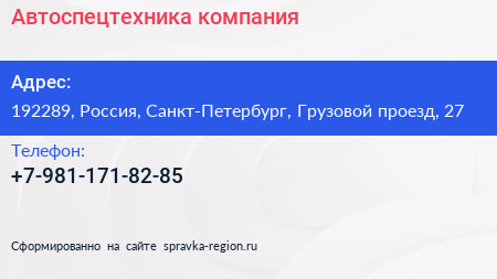 Автоспецтехника, компания по адресу 192289, Россия, Санкт-Петербург, Грузовой проезд, 27 в дальнейшем Организация, размещена в следующих категориях: